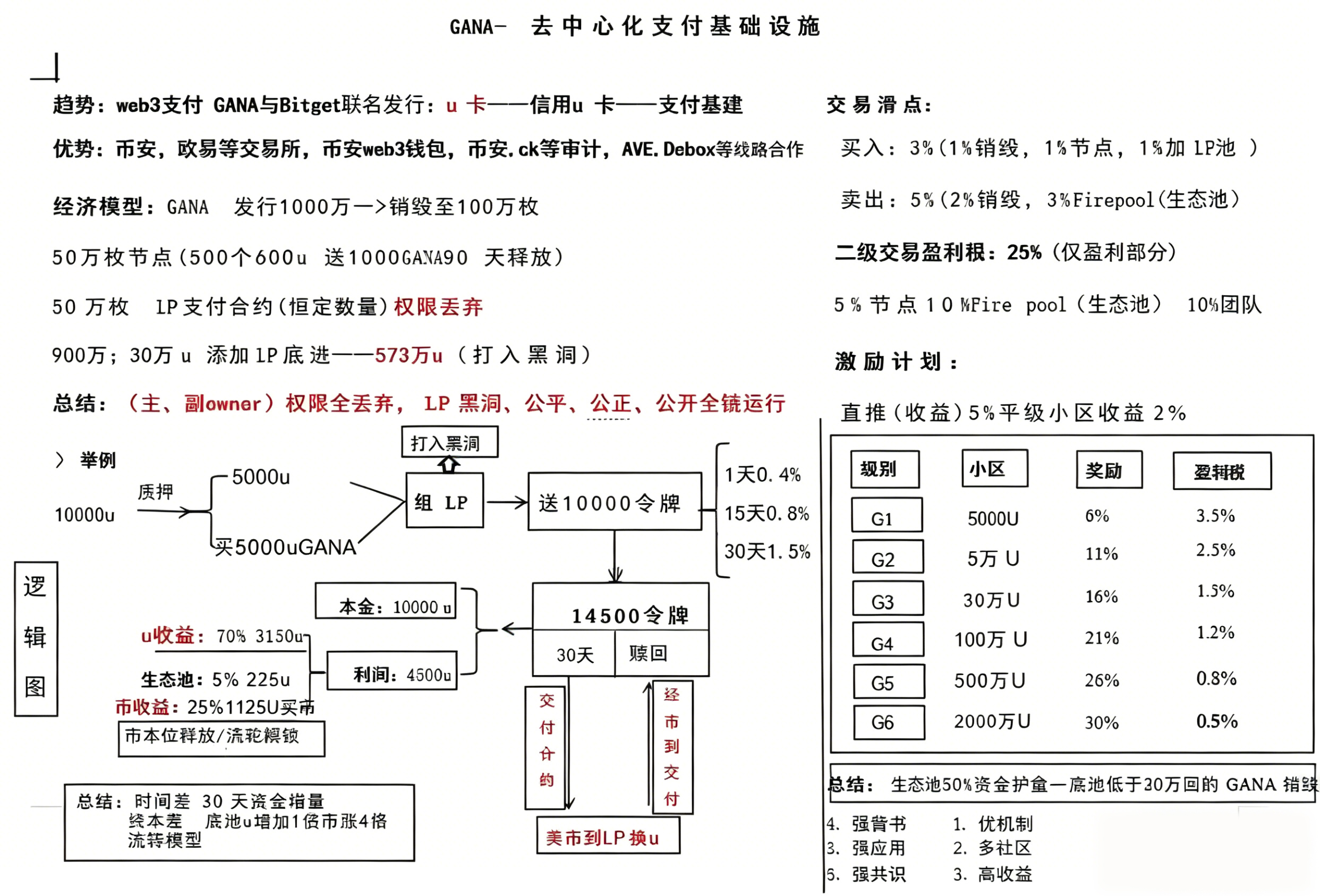 GANA项目的经济模型与支付生态,重点阐述了其基于智能合约的“涡轮增压”机制、资金安全兜底策略及与Bitget联名的U卡支付解决方案,旨在消除市场疑虑并推动团队建设。